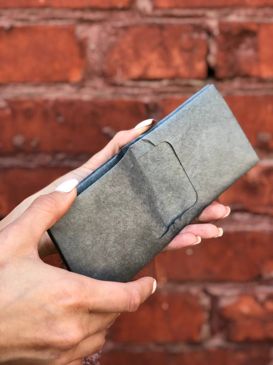 Кошелек Origami Gray выполнен из необычного Крафт материала Tyvek (Тайвек), который устойчив к дождю и снегу, его можно даже мыть в стиральной машине, в холодной воде. Материал ультра легкий и прочный.