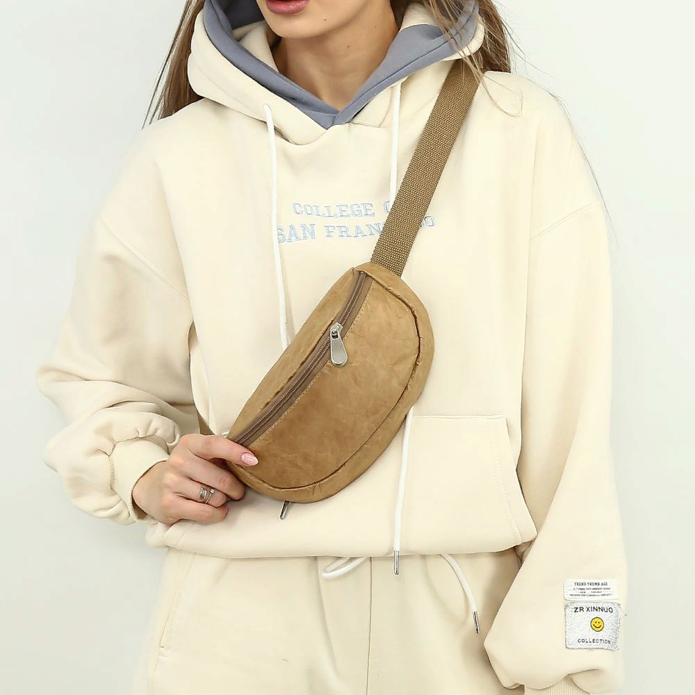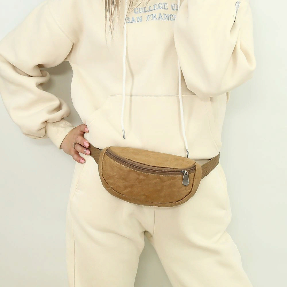 Поясная сумка Banny Кraft выполнена из необычного Крафт материала Tyvek (Тайвек), который устойчив к дождю и снегу, его можно даже мыть в стиральной машине, в холодной воде. Материал ультра легкий и прочный.