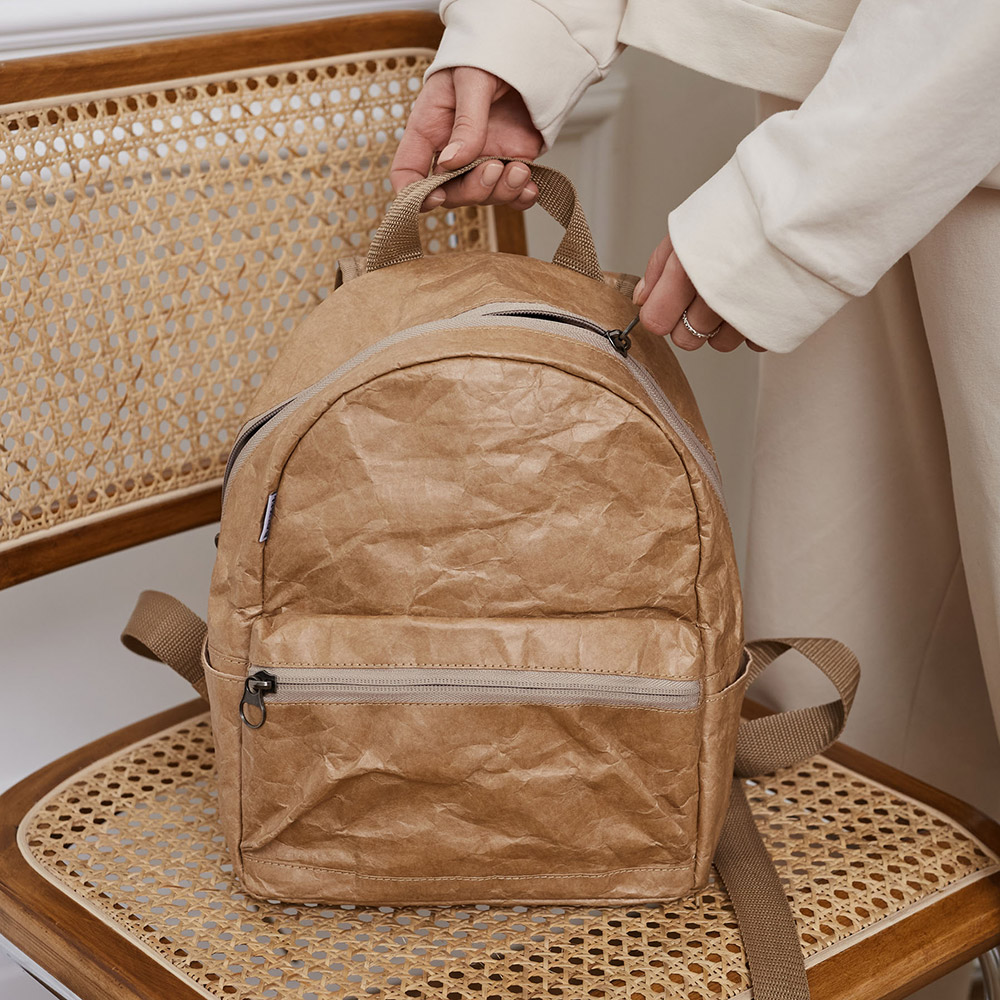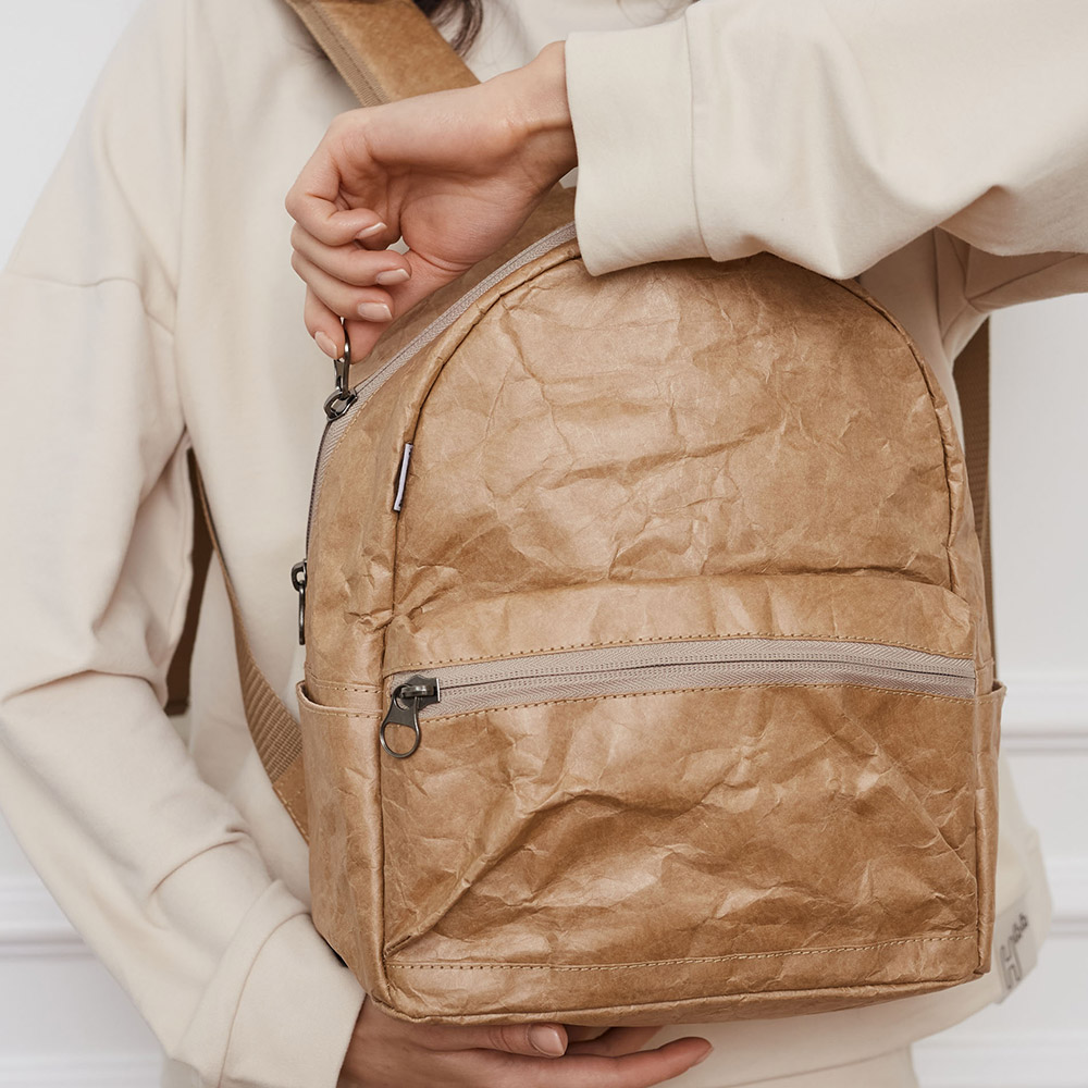 Рюкзак Latifa Kraft выполнен из необычного Крафт материала Tyvek (Тайвек), который устойчив к дождю и снегу, его можно даже мыть в стиральной машине, в холодной воде. Материал ультра легкий и прочный.